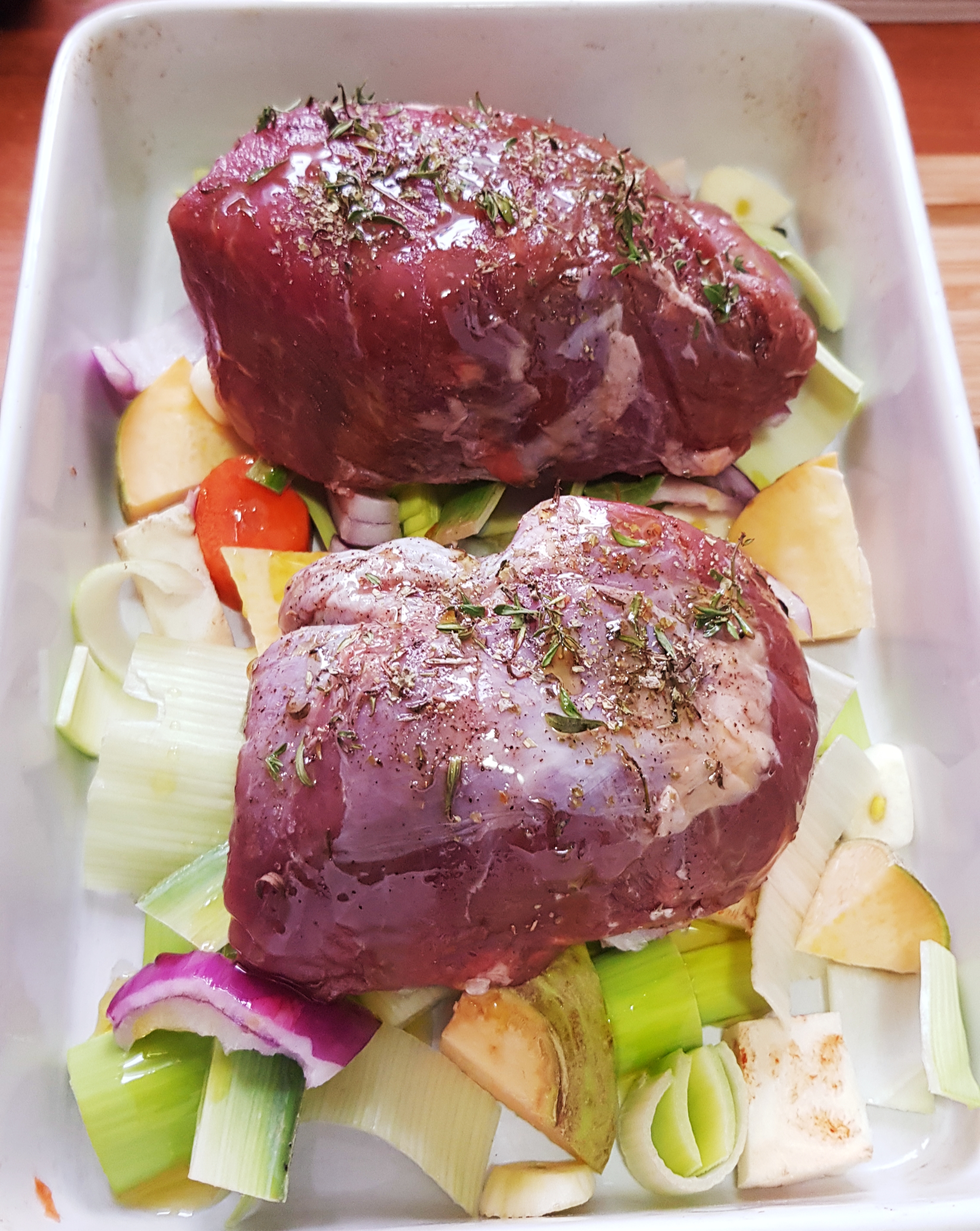 Jušno zelenjavo narežemo na manjše kose in jo damo na dno pekača. Dodamo še česen, cel poper in lovor. Na zelenjavo položimo meso, ki smo ga solili, dodali majaron in timijan. Čez polijemo olivno olje in damo pečt. Peče se različno dolgo, odvisno od velikosti mesa. Med pečenjem polivamo s pivom, vinom in jušno osnovo. Ko je meso mehko, je pečeno. Poskusimo z vilicami. Nato meso poberemo iz pekača in precedimo omako v manjši lonček. Omako nato zgostimo s škrobom. Na koncu dodamo še sesekljan peteršilj.