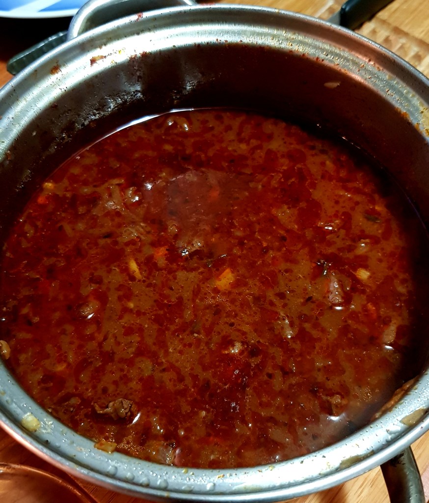 Najprej govedino narežemo na kocke in sesekljamo čebulo in česen. V posodi prepražimo čebulo, proti koncu dodamo česen in dodamo meso. Vse skupaj dušimo 20 minut, nato dodamo mezgo in papriko( zraven lahko dodate tudi malo pekoče, če imate radi, da golaž peče). Zalijemo z vinom. Pustimo 5 minut, da vino povre. Dodamo vse začimbe in nato zalijemo z vodo. Vode mora biti samo za prst nad mesom. Golaž se kuha, dokler meso ni mehko. Sproti pazimo, da nam voda preveč ne povre, zato jo moramo dolivati.