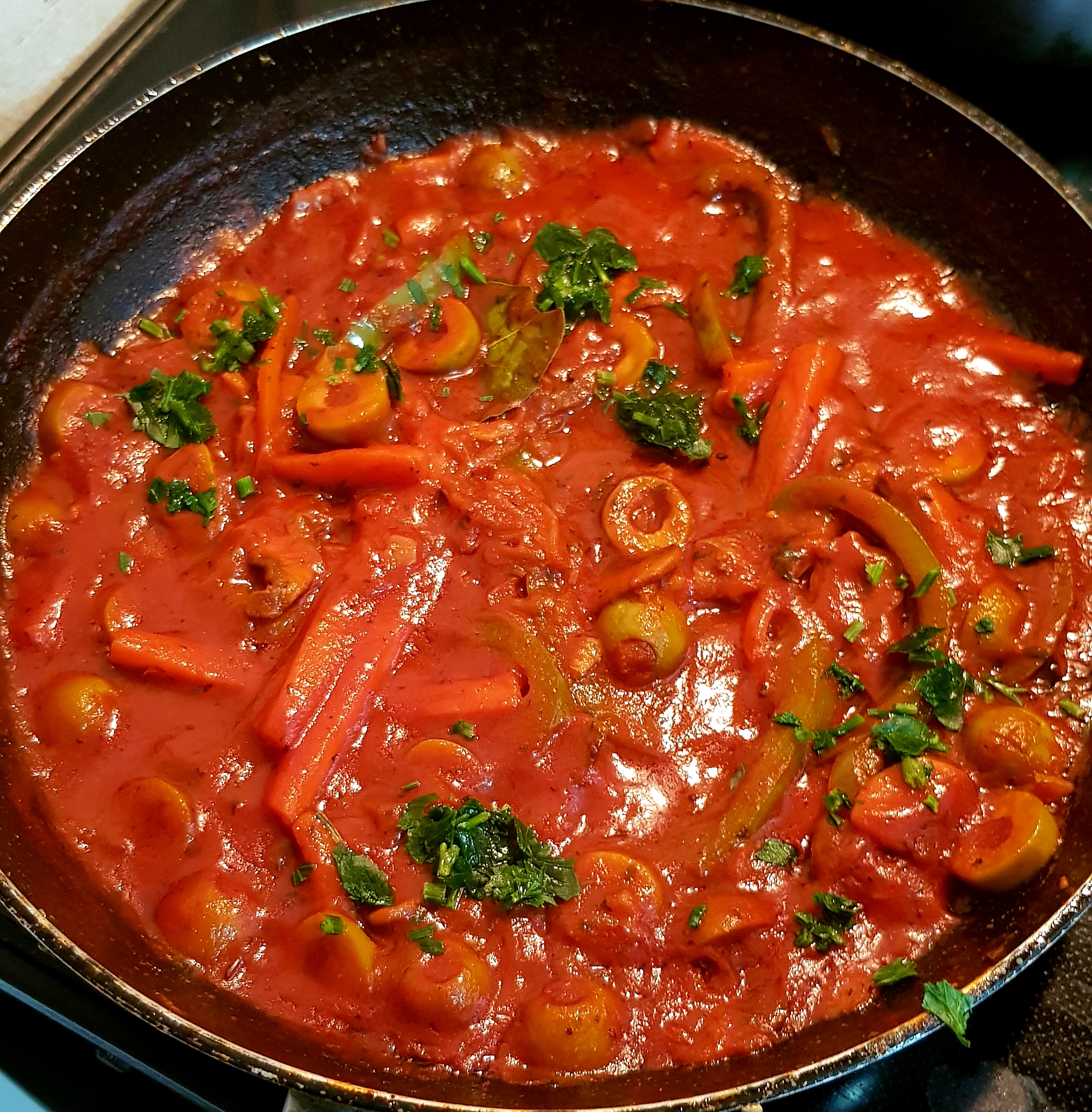 Najprej v pekač damo piščanca, ki smo ga solili in prelili z oljem. Damo ga pečt za eno uro na 200 °C. Nato pripravimo vse sestavine za omako, vse narežemo na trakce. Nato prepražimo čebulo, dodamo česen, gobe, korenje, papriko, olive in dušimo 10 minut. Nato dodamo začimbe in dodamo vino. Dušimo dokler vino ne povre, nato dodamo zmiksane pelate in zajemalko juhe. Vse skupaj dušimo še 15 minut in omaka je končana.