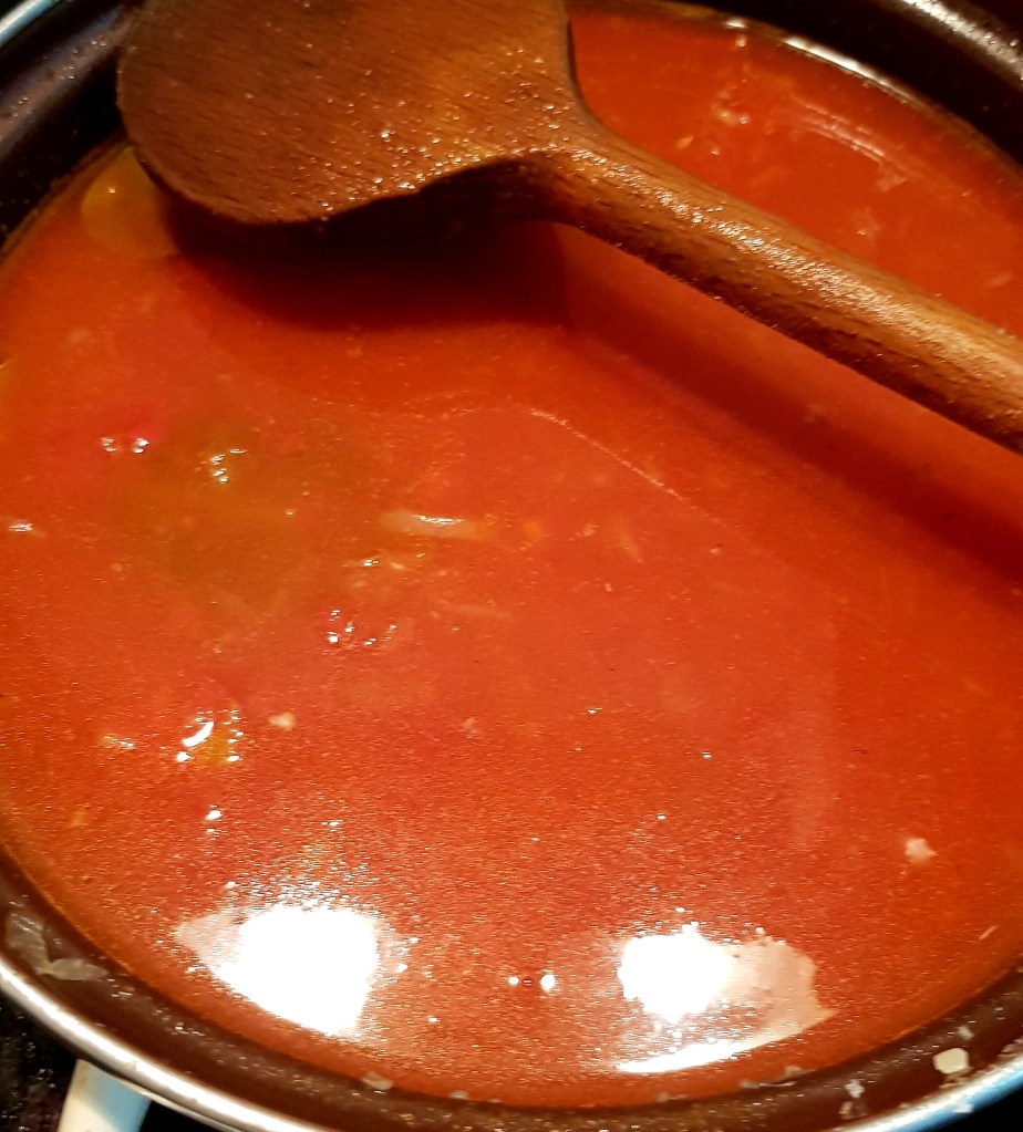 Najprej prepražimo čebulo, ji dodamo česen in na večje kose narezan paradižnik, por in peteršilj. Dodamo lovor in ostale začimbe, ter dušimo, dokler tekočina ne povre. Nato dodamo pelate, mezgo, papriko in rdeče vino. Zalijemo z vodo. Kuhamo pol ure, nato pa s paličnim mešalnikom spasiramo in precedimo juho. Zgostimo z gustinom in preden postrežemo, damo v krožnik dušen riž.