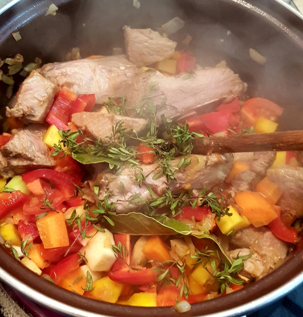 Na maščobi prepražimo čebulo, nato ji dodamo na koščke narezano meso in česen. Vse skupaj dušimo pet minut in nato dodamo na kocke narezano zelenjavo. Dušimo še par minut, dodamo lovor, majaron, timijan, mezgo in mleto papriko. Zalijemo z vinom. Po petih minutah pa še z vodo in pa dodamo na večje kose narezan krompir. Kuhamo 1 uro oziroma dokler meso ni mehko.