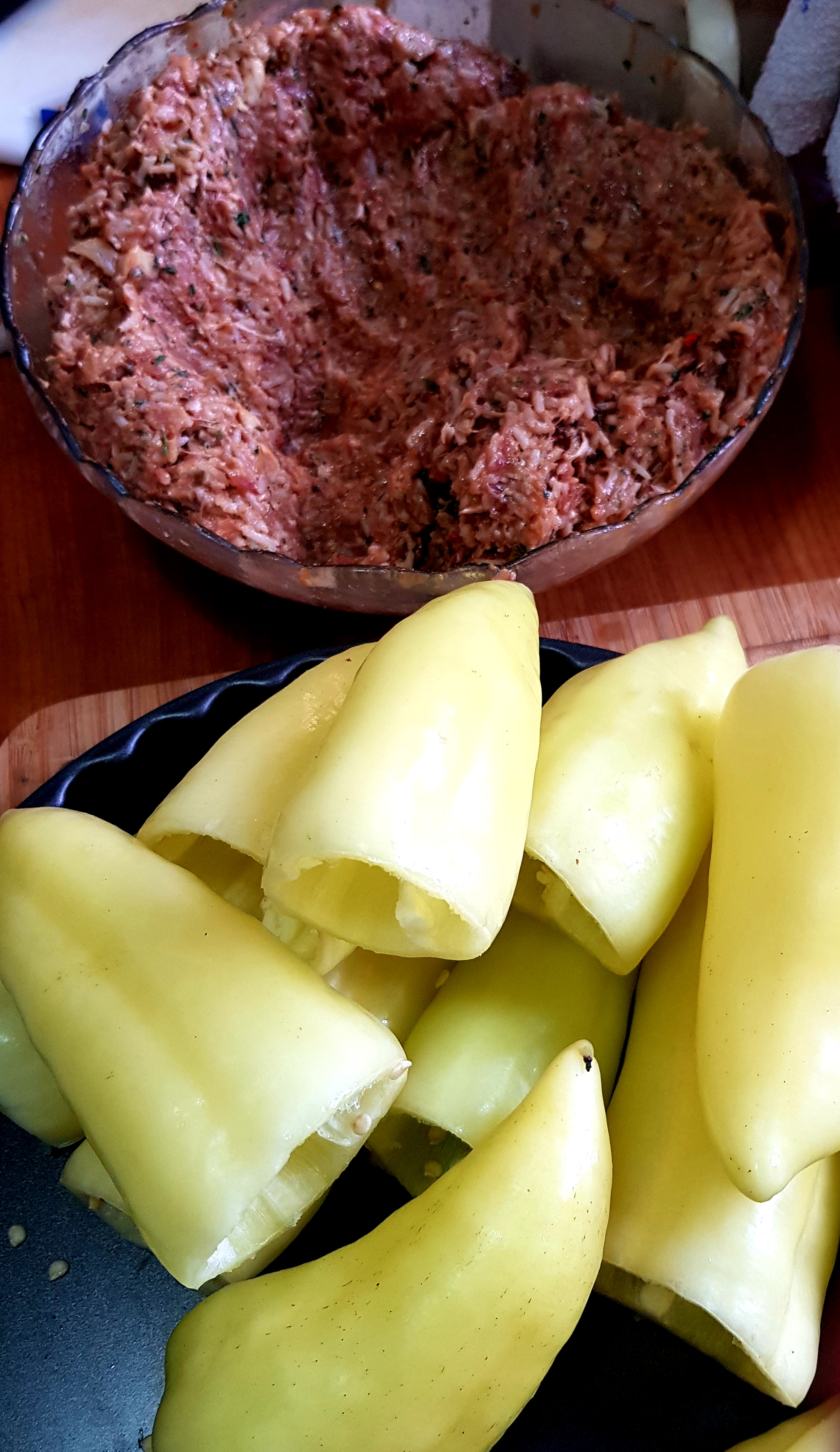 Vse sestavine dobro premešamo , s tem, da moramo čebulo in česen prej prepražiti. Nato napolnimo paprike. Če nam kaj mase ostane, naredimo čufte in jih kuhamo zraven paprik.