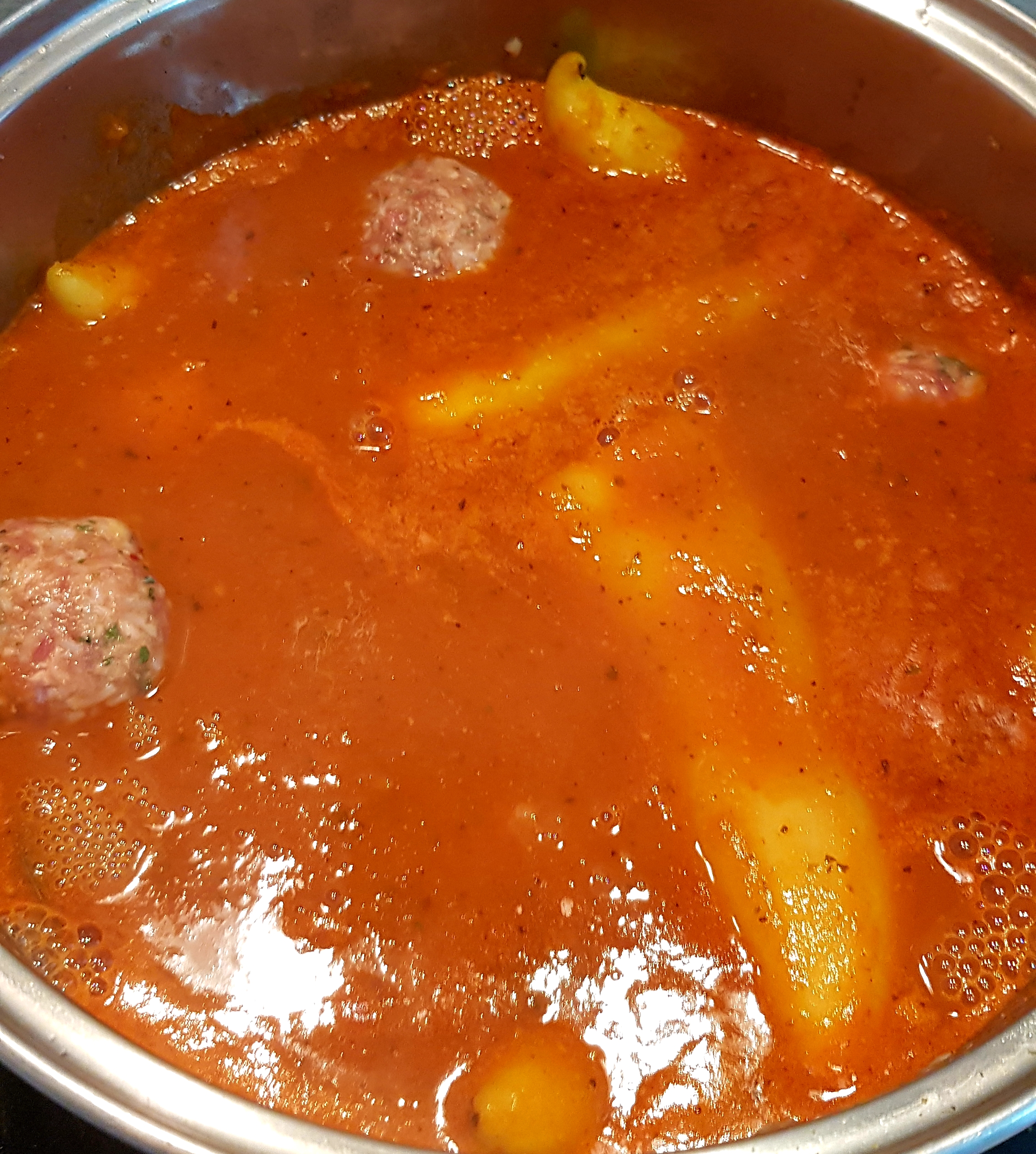 Čebulo prepražimo in česen prepražimo ( česen damo na koncu samo toliko, da zadiši). Dodamo paradižnik, ki ga malo prepražimo, nato dodamo še mezgo, sol, poper, sladkor, mleto papriko, zalijemo z vinom in dodamo pelate. Nato zalijemo z vodo. Pustimo 10 minut vreti nato spasiramo s paličnim mešalnikom, da dobimo gladko omako. Dodamo lovor in ostale začimbe. Nato v omako damo polnjene paprike in čufte. Vse skupaj kuhamo 1 uro. Po potrebi, če je omaka preredka oziroma, da jo malo povežemo jo zgostimo s škrobom.
