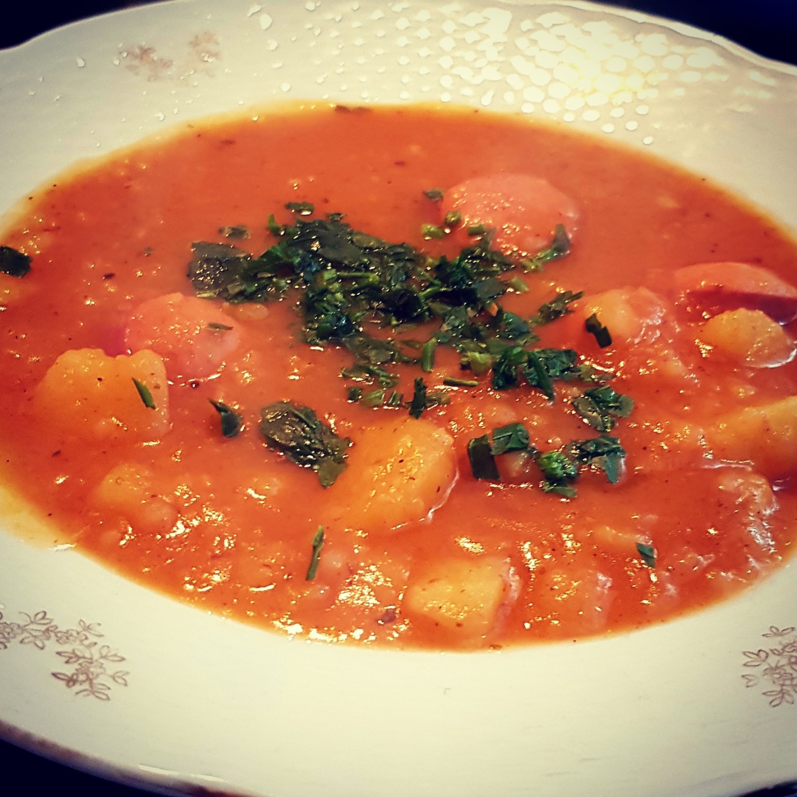 Sestavine: 1 žlica masti ali druge maščobe 150 g čebule ( 1 velika ali 2 manjši) 900 g krompirja 3 lovor 3 stroke česna 1 čajna žlička paradižnikovega koncentrata 2 čajni žlički mlete paprike 2 jedilni žlici moke Sol, poper Majaron 1 hrenovka Peteršilj 1,2 l vode Potek dela: Najprej olupimo krompir in ga narežemoContinue reading “Krompirjev golaž s hrenovko”