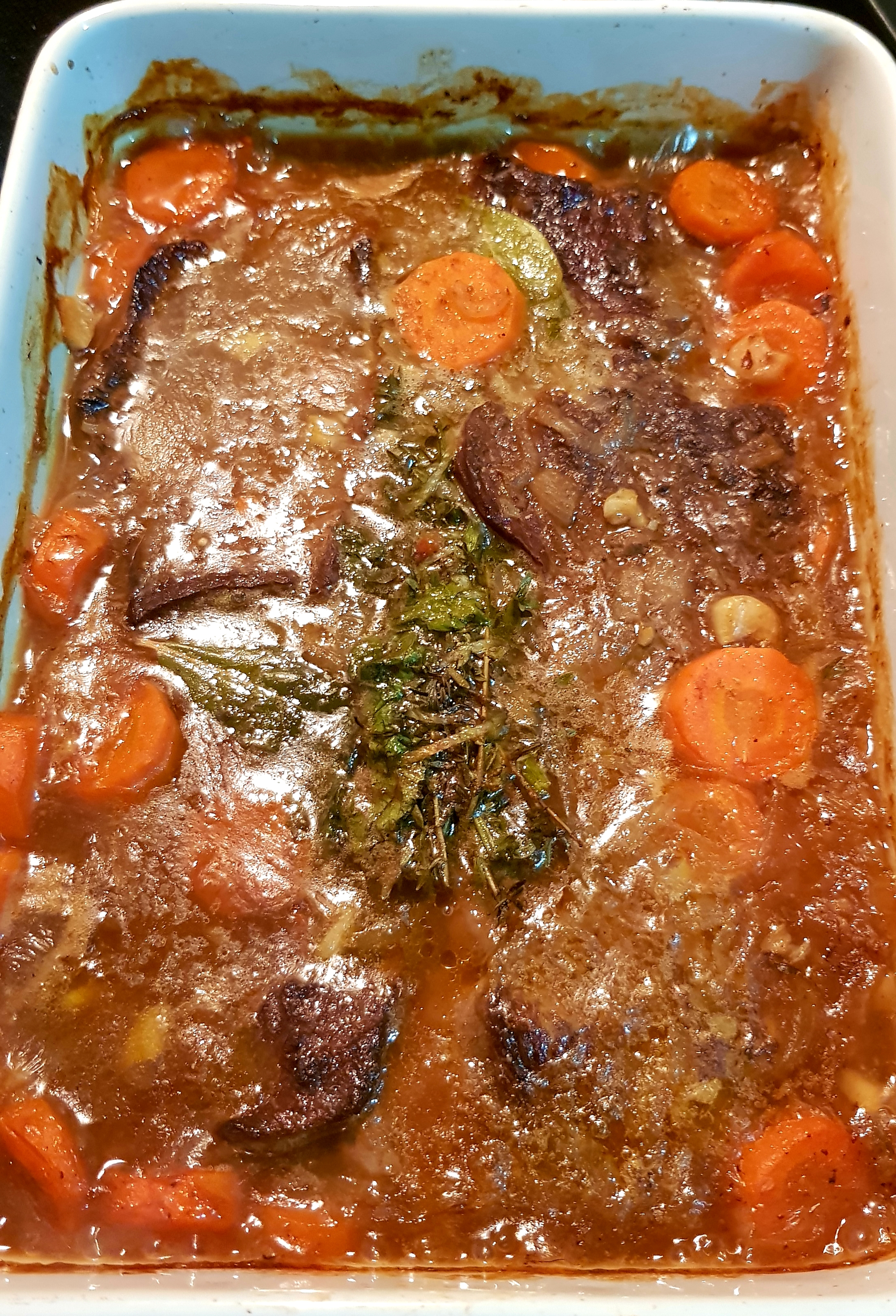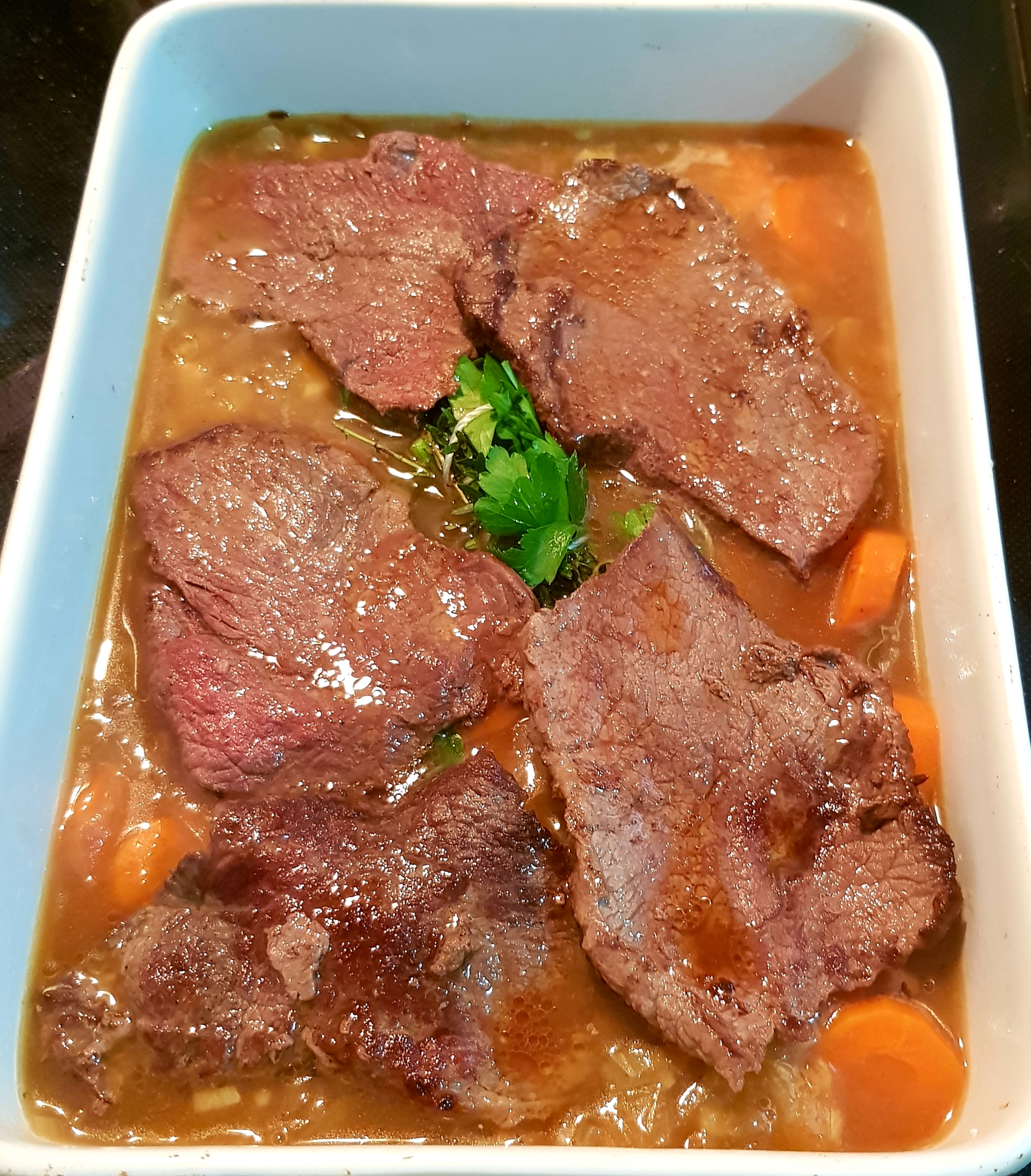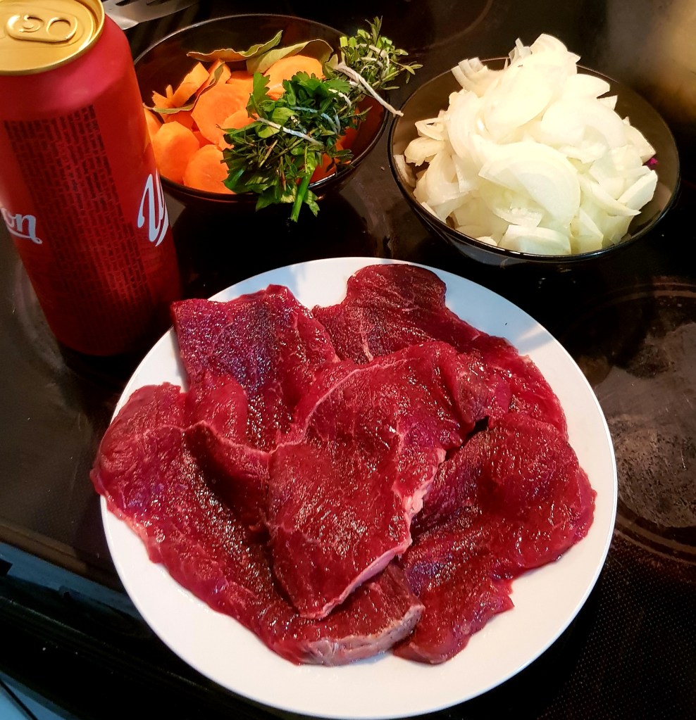 Najprej pripravimo vse sestavine, nato pa popečemo zrezke na maslu. Ko so pečeni, jih poberemo iz posode in prepražimo še čebulo. Nato dodamo korenje in česen. Zalijemo s pivom in jušno osnovo, ter zgostimo s škrobom. Vse skupaj pretresemo v pekač, dodamo šopek začimb in na vrh položimo zrezke. Pekač pokrijemo s pokrovom, oziroma folijo, če nimamo pokrova. Vse skupaj dušimo 1 uro na 180°C, nato dodamo jušno osnovo po potrebi, in preverimo trdoto mesa. Če je meso še trdo nadaljujemo z dušenjem dokler ni mehko.