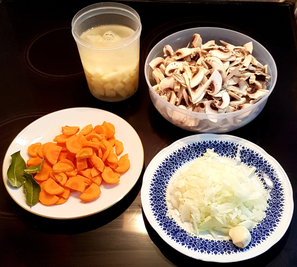 Najprej prepražimo čebulo in česen, nato dodamo na drobno narezane gobe, na kolobarčke narezano korenje in na koncu na kocke narezan krompir. Dodamo začimbe in kislo smetano, ter zalijemo z vodo. Vse skupaj kuhamo 40 minut, nato pa dodamo prežganje iz olja in moke. Kuhamo še 15 minut. Na koncu dodamo še sesekljan peteršilj.