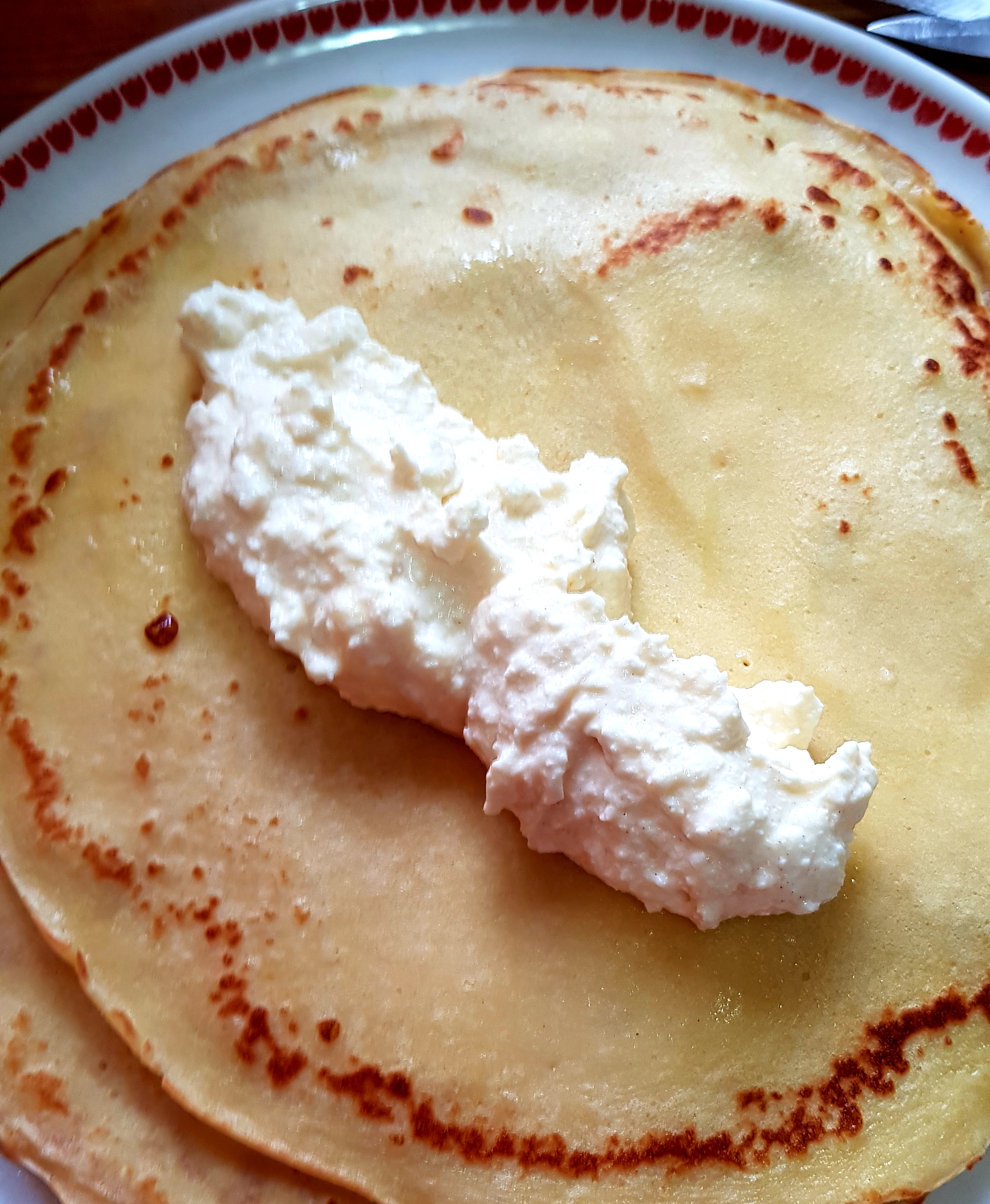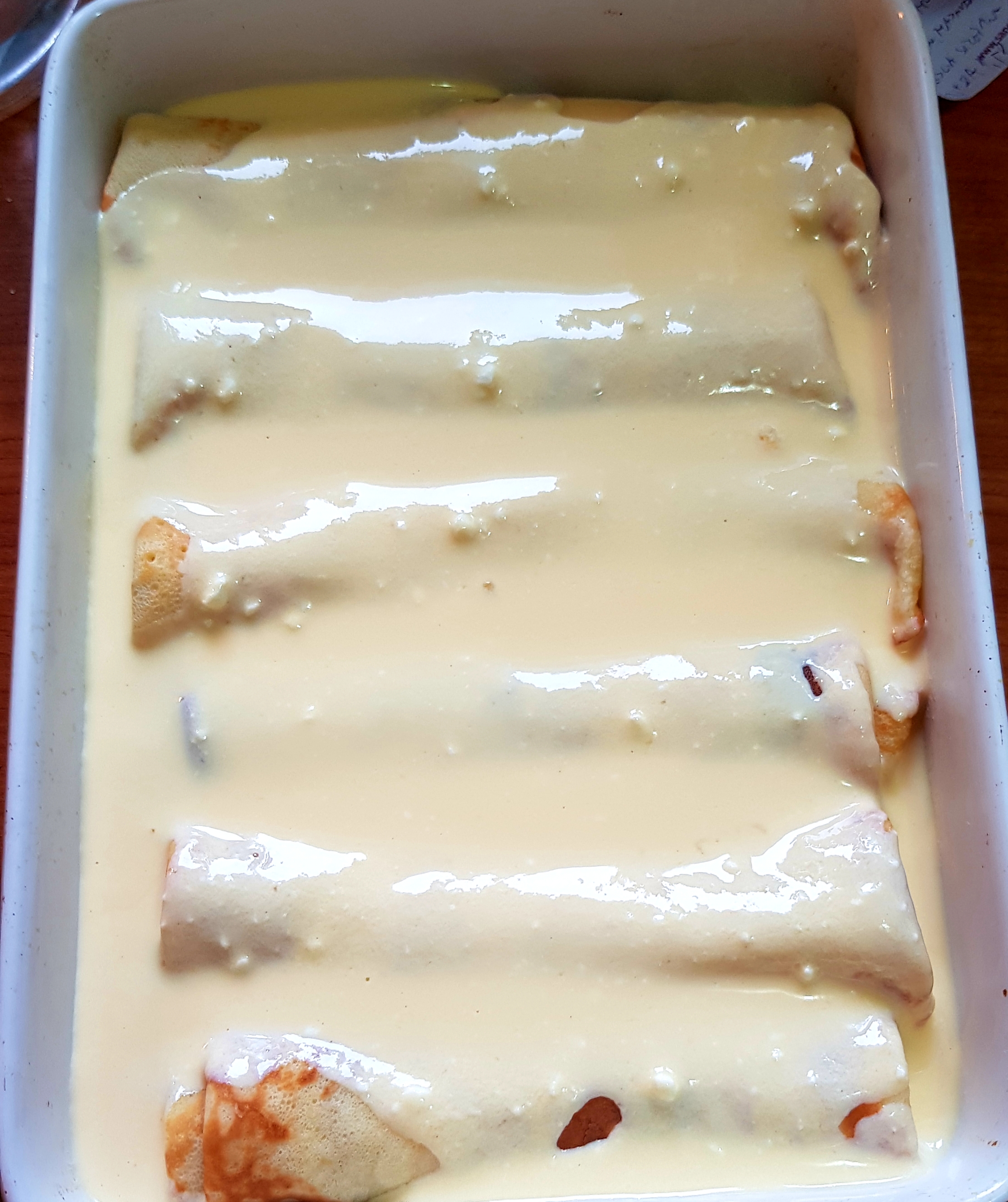 Iz sestavin za palačinke naredimo maso in spečemo palačinke. Nato v posodi skupaj zmešamo vse sestavine za nadev, rozine pa smo prej namočili v rumu. Ko imamo palačinke in maso narejeno, damo na vsako palačinko 2 žlici nadeva,palačinke prepognemo najprej na robu, da nam nadev ne steče ven iz palačink, nato pa zavijemo. Zložimo palačinke v pekač, in prelijemo s prelivom, ki smo ga zamešali iz sestavin. Pečemo v ogreti pečici na 180°C približno 25 minut. Na koncu posujemo s sladkorjem v prahu.