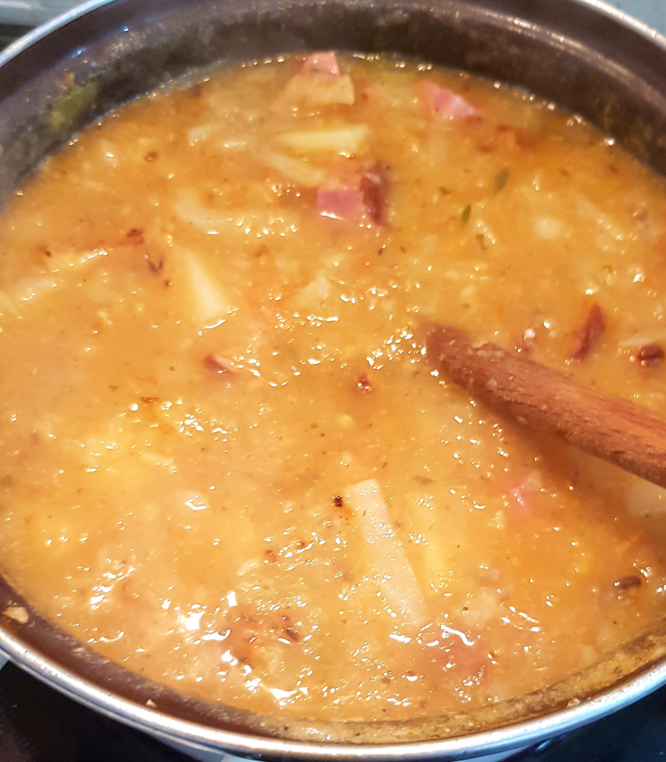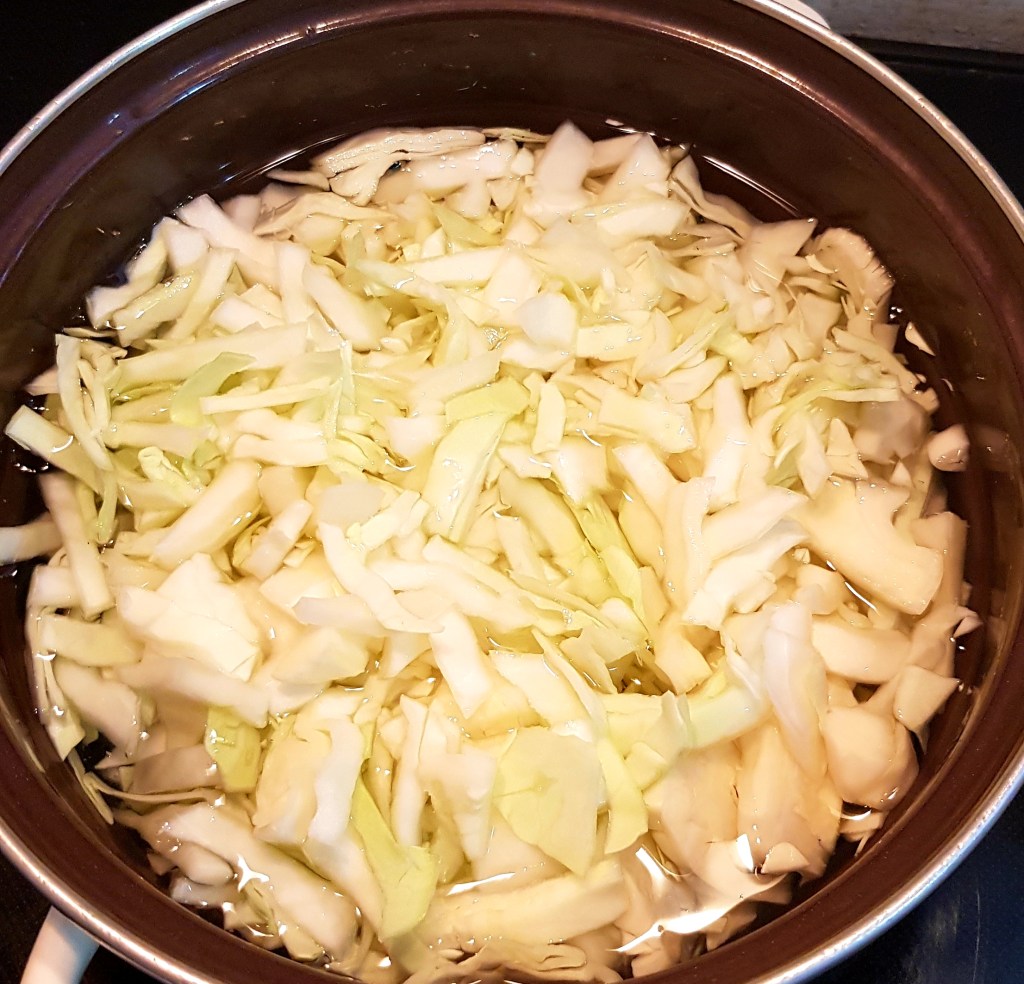 Zelje narežemo na tanke rezine in ga zalijemo z vodo. Dodamo polovico na kocke narezanega krompirja, začimbe, sol in poper. Kuhamo 25 minut, nato pa s paličnim mešalnikom na hitro zmiksamo. Prej odstranimo lovor.Ne smemo preveč zmiksati ( pritisnemo samo 3x do 4x), da ne postane kaša.Nato dodamo še drugo polovico na kocke narezanega krompirja in suho meso ( lahko je jed tudi brez mesa) . Kuhamo 15 minut, nato pa dodamo prežganje, ki smo ga naredili iz pražene čebule, česna, moke, mezge in paprike. Vse skupaj kuhamo še približno 20 minut oziroma dokler krompir ni kuhan.