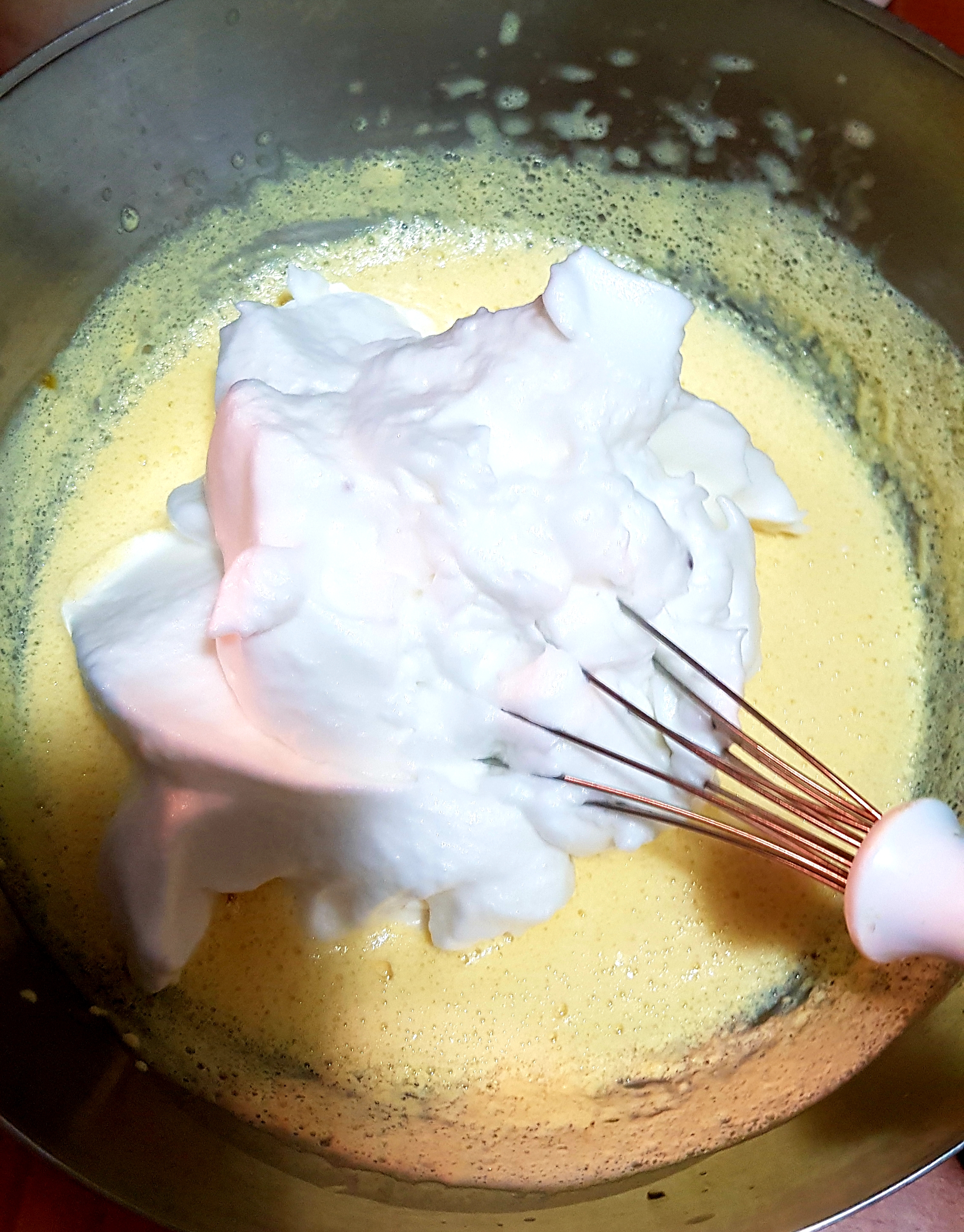 Ločimo rumenjake in beljake, nato pa na vodni kopeli stepamo rumenjake in sladkor, ter vanilijev sladkor. Če delamo s strokom, damo strok v mleko, ki ga zavremo. Dodamo žlico gustina in rum med rumenjake in zalijemo z vrelim mlekom. Omako kuhamo približno 10 minut, vendar pazimo, da nam ne zavre, mora biti na meji. Počakamo, da se malo ohladi. Nato ji dodamo sneg iz beljakov v katerega smo dali 3 žlice sladkorja in na rahlo zmešamo.