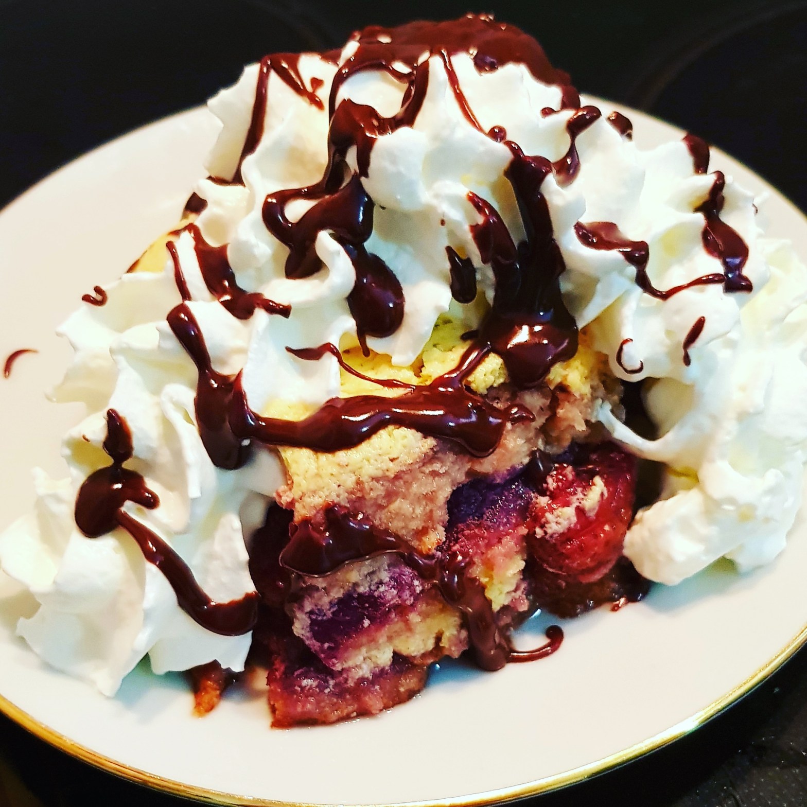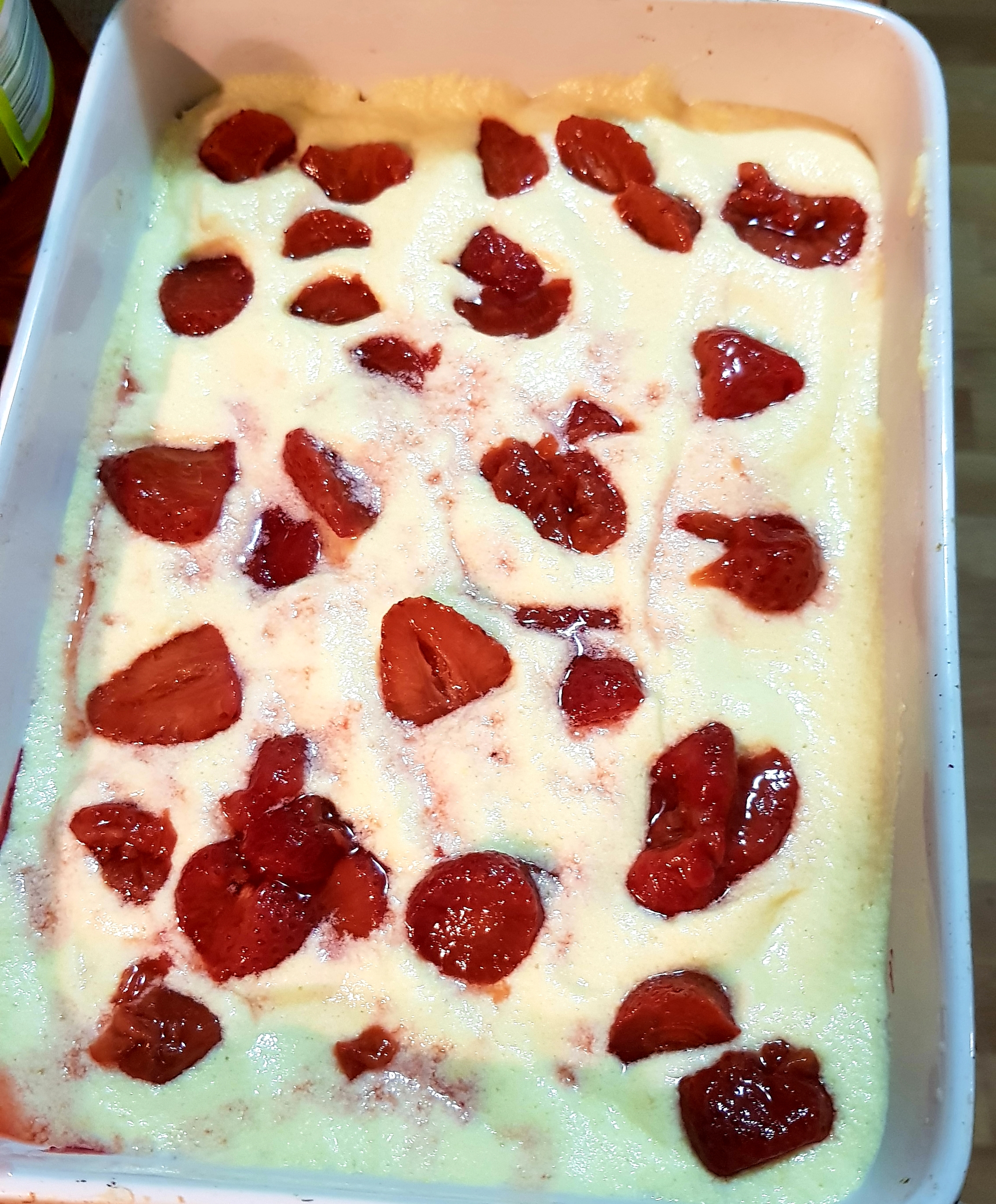 Biskvit razrežemo po dolgem na 3 enake dele, nato damo v pekač en del biskvita. Čez biskvit polijemo jagodni kompot. Nato namažemo biskvit z jagodno omako. Nato damo tretjino vanilijeve omake in na omako narežemo jagode. Na to zopet damo biskvit in ponovimo. Na vrh damo še tretji del biskvita ga polijemo s kompotom, ter zadnjo tretjino vanilijeve omake. Pustimo čez noč v hladilniku, da se sestavine prepojijo. Nato pa damo na krožnik, kjer dodamo stepeno sladko smetano in polijemo s stopljeno čokolado( na vodni kopeli pogrejemo čokolado in malo mleka). Poleti lahko zraven dodamo tudi jagodni sladoled.