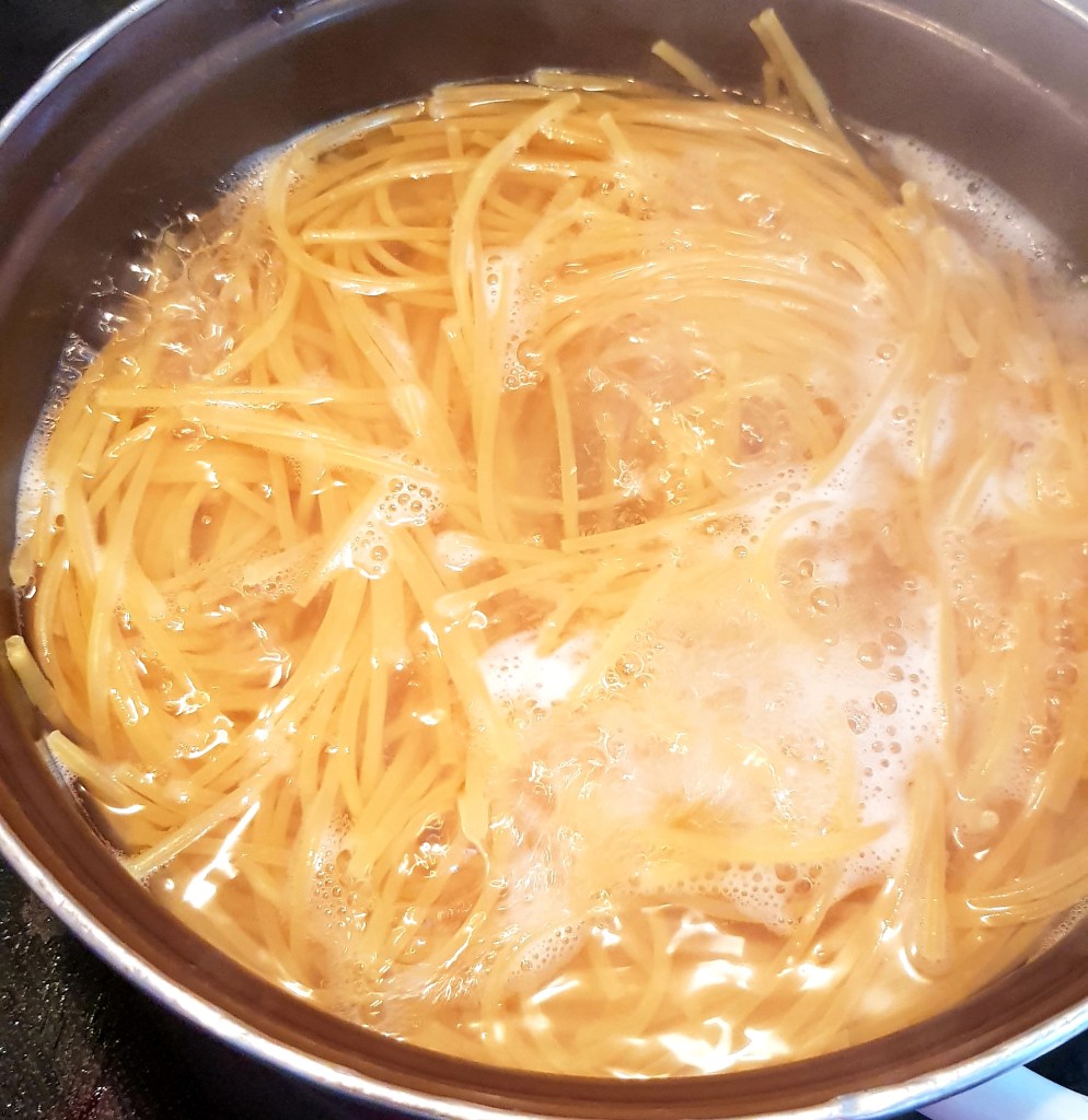 Čebulo prepražimo, nato ji dodamo strti česen, ter meso, katerega smo prej malo zalili z vodo, da se razpusti. Dodamo vse začimbe in dušimo, dokler ne povre voda. Nato dodamo mezgo in papriko, ter zalijemo z vinom. Pustimo, da vino povre, nato pa zalijemo z vodo. Kuhamo pol ure, na koncu pa še zgostimo z gustinom. Posebej skuhamo špagete, ki naj bodo al`dente. Na koncu dodamo še parmezan in peteršilj.