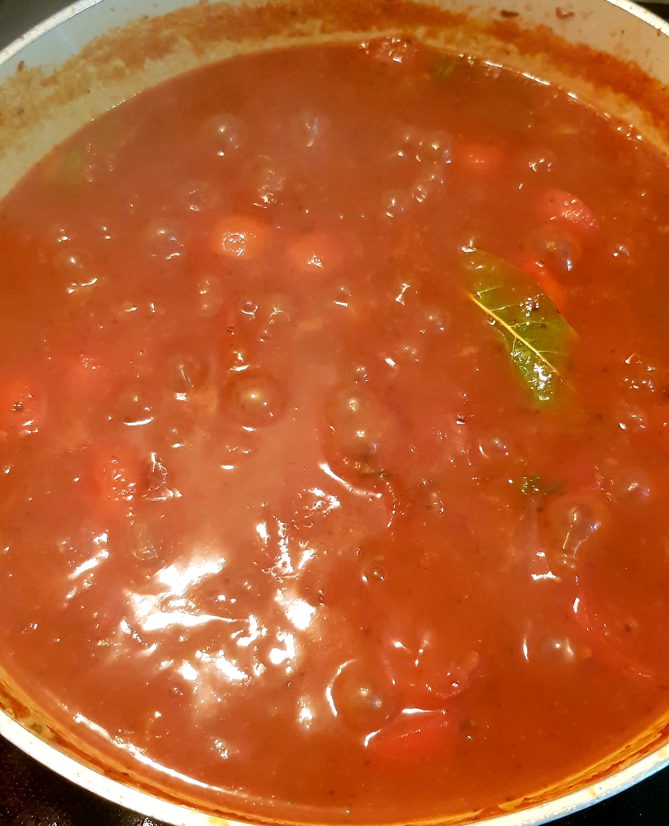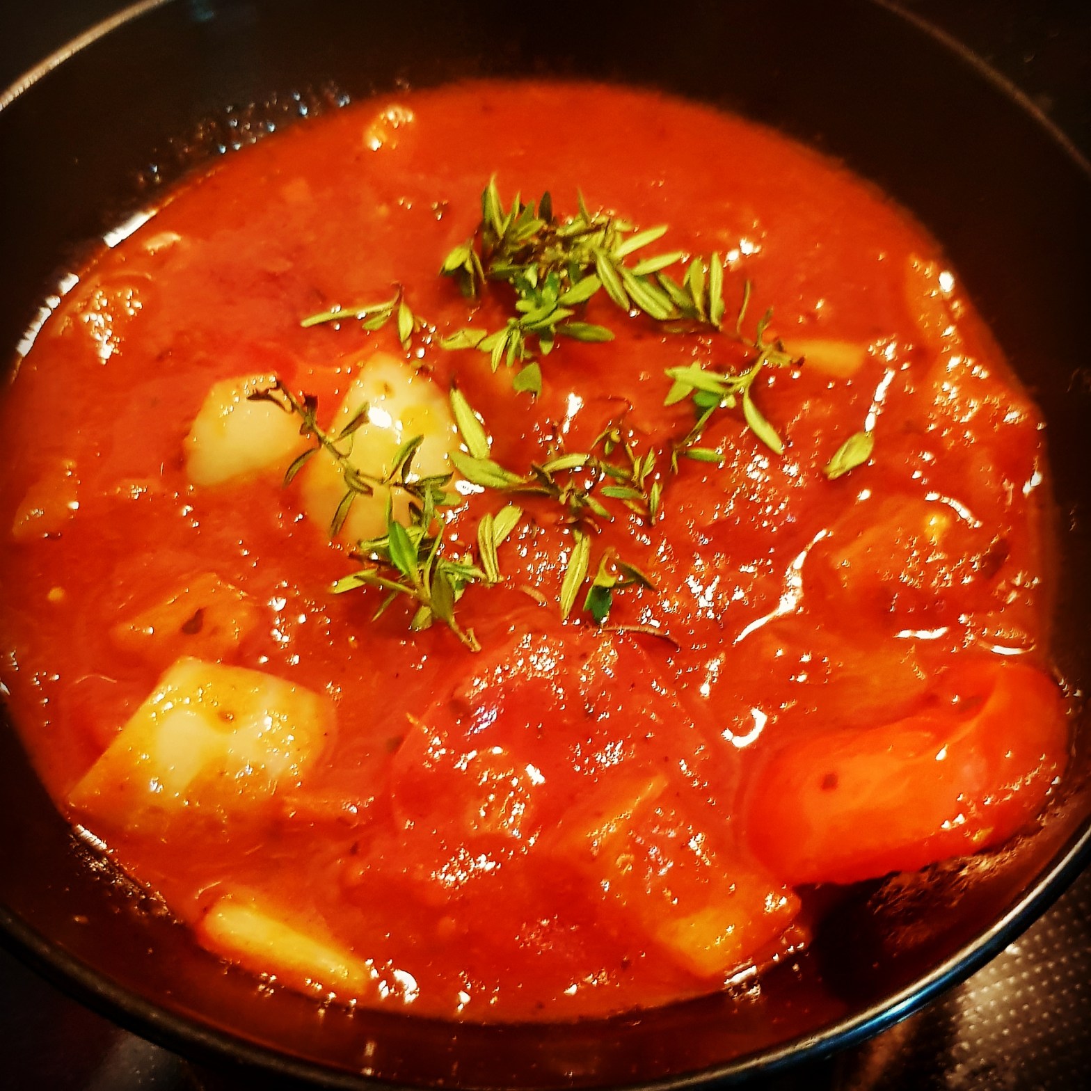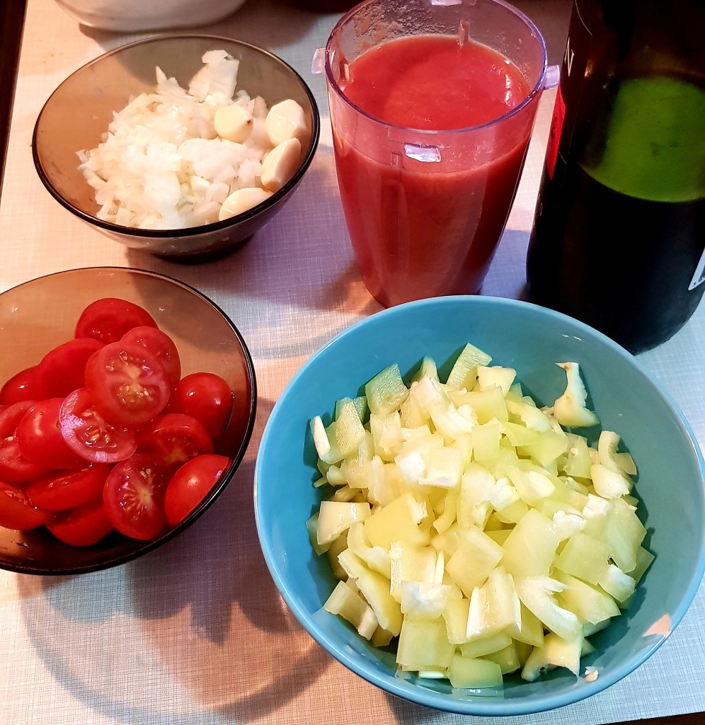 Prepražimo čebulo, dodamo na kocke narezano papriko, malo kasneje še paradižnik. Dodamo začimbe, ter zalijemo z vinom. Pustimo, da se duši, nato, dodamo mleto papriko in zalijemo z zmiksanimi pelati. Vse skupaj kuhamo približno 20 minut. Če se preveč zgosti, zalijemo z vodo.