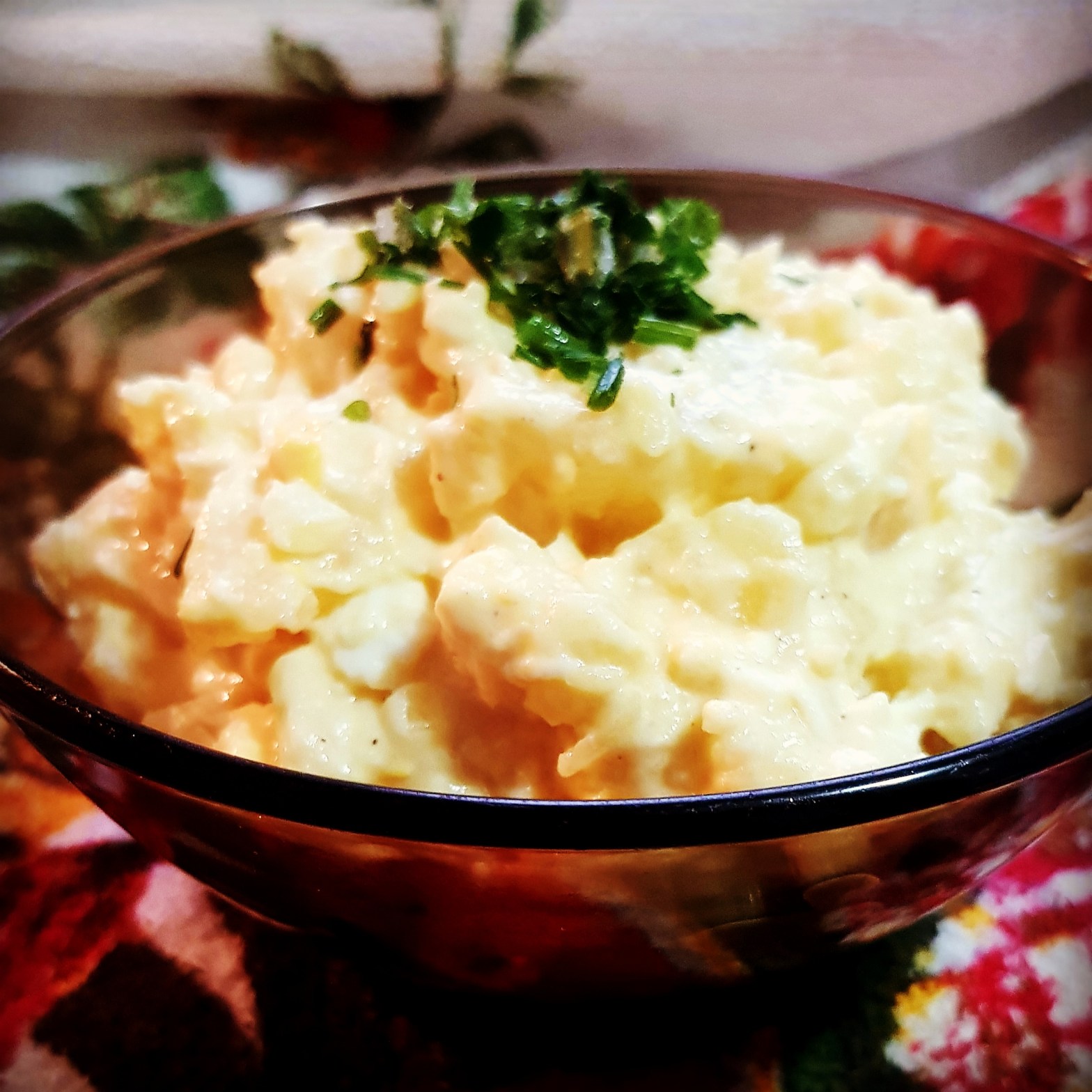 Krompir narežemo na tanke rezine, dodamo sesekljano čebulo, ter naribano jajce. Dodamo še vse ostale sestavine, ter dobro premešamo. Če je pregosto ali prekislo, malo zalijemo z vodo.